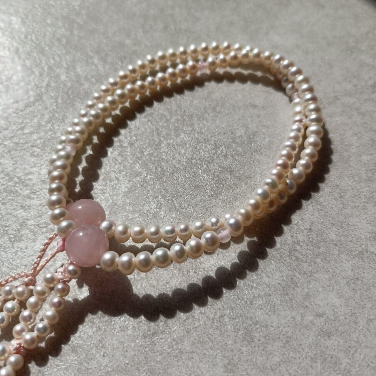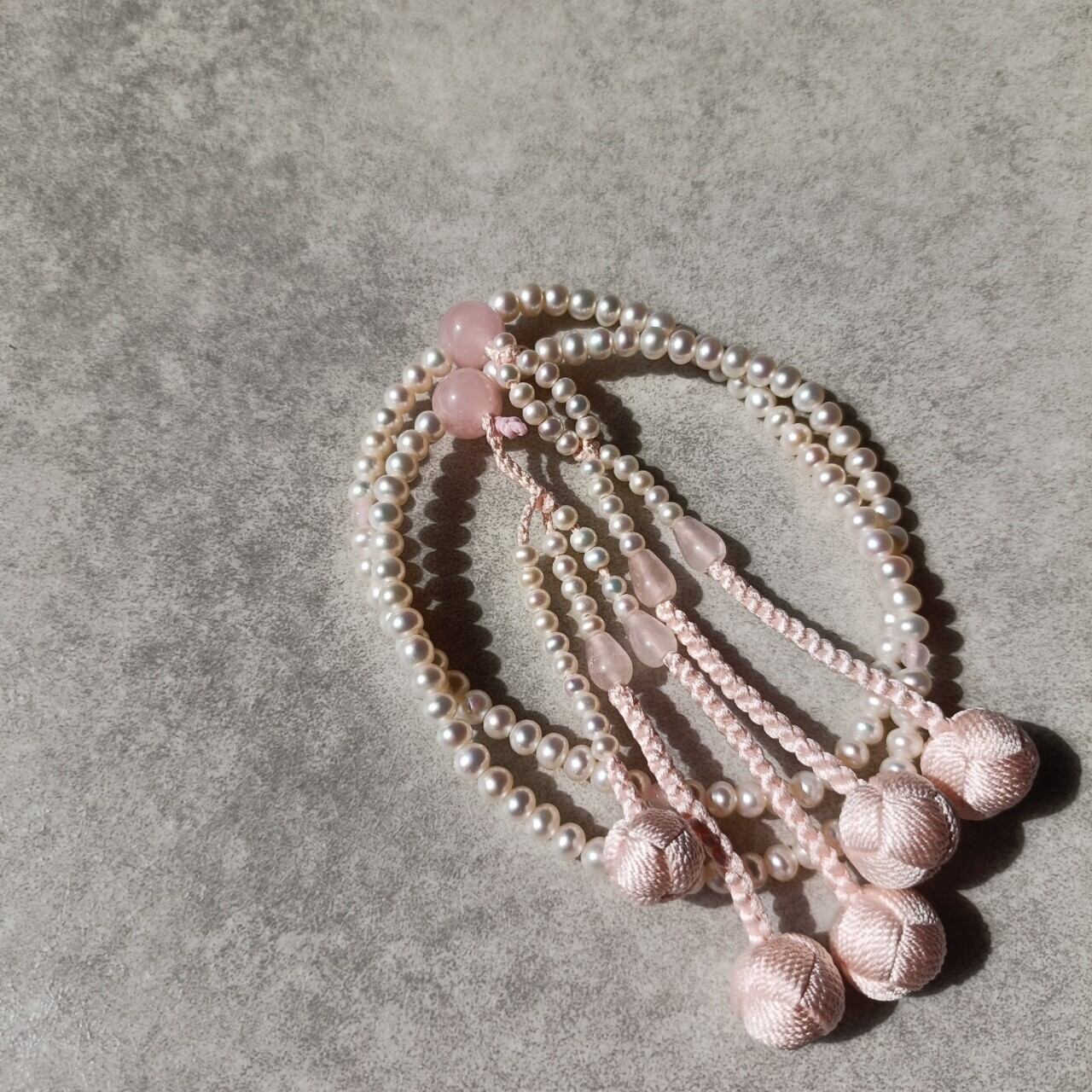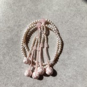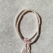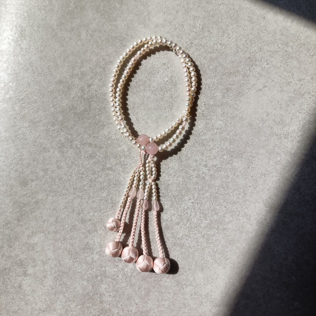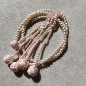 おおらかで清浄な輝きの淡水パールを優しい色合いの紅水晶で仕立てた女性用数珠です。