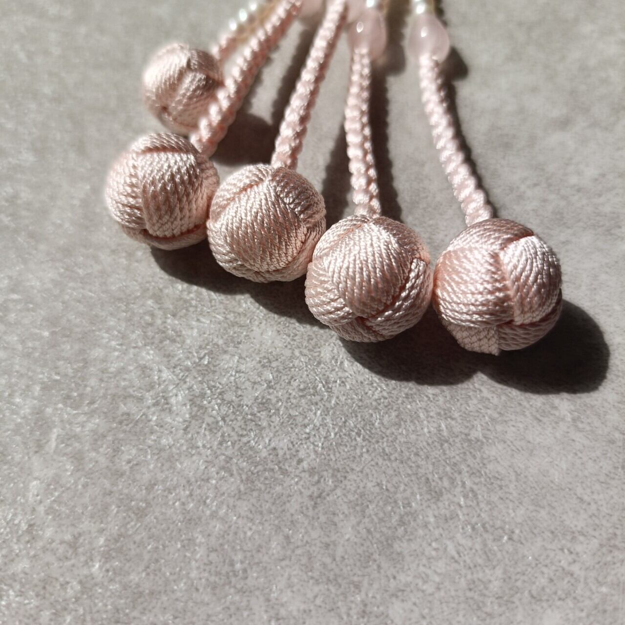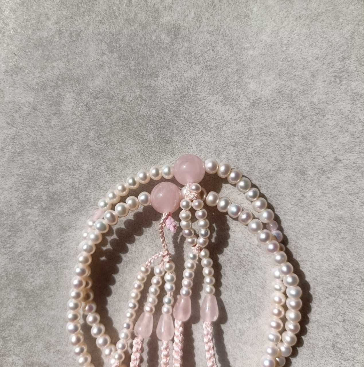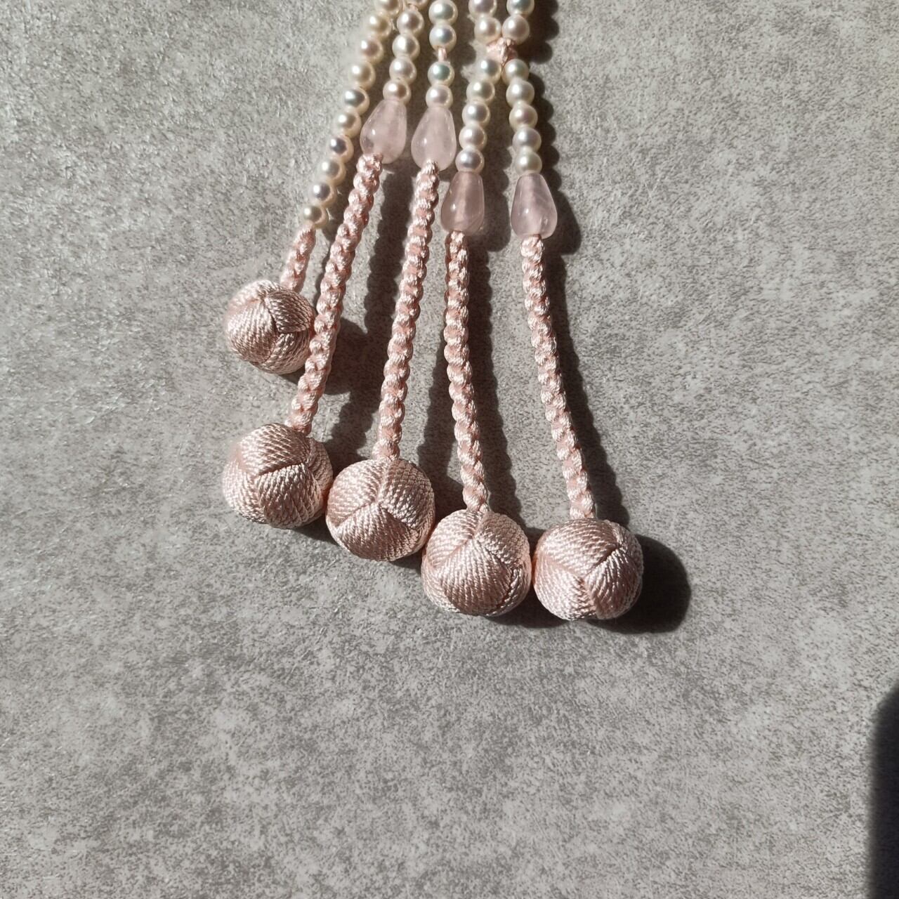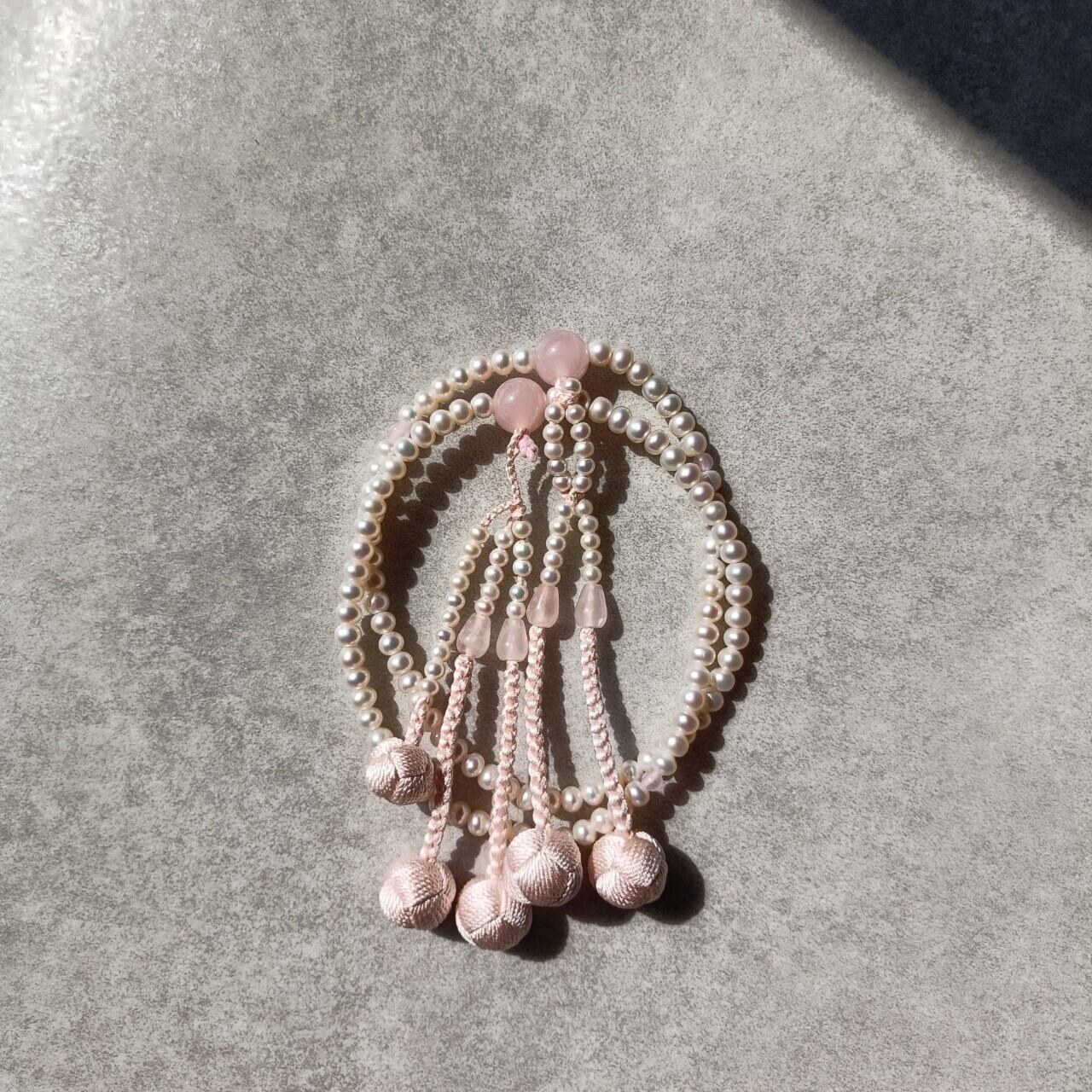 おおらかで清浄な輝きの淡水パールを優しい色合いの紅水晶で仕立てた女性用数珠です。