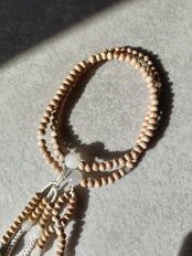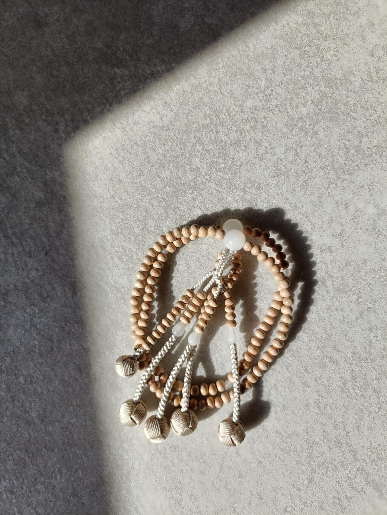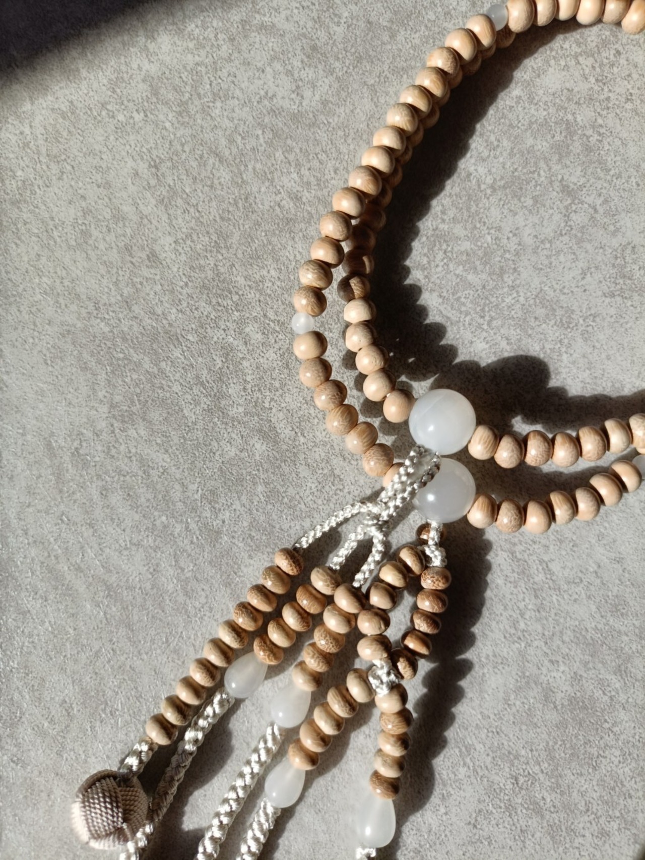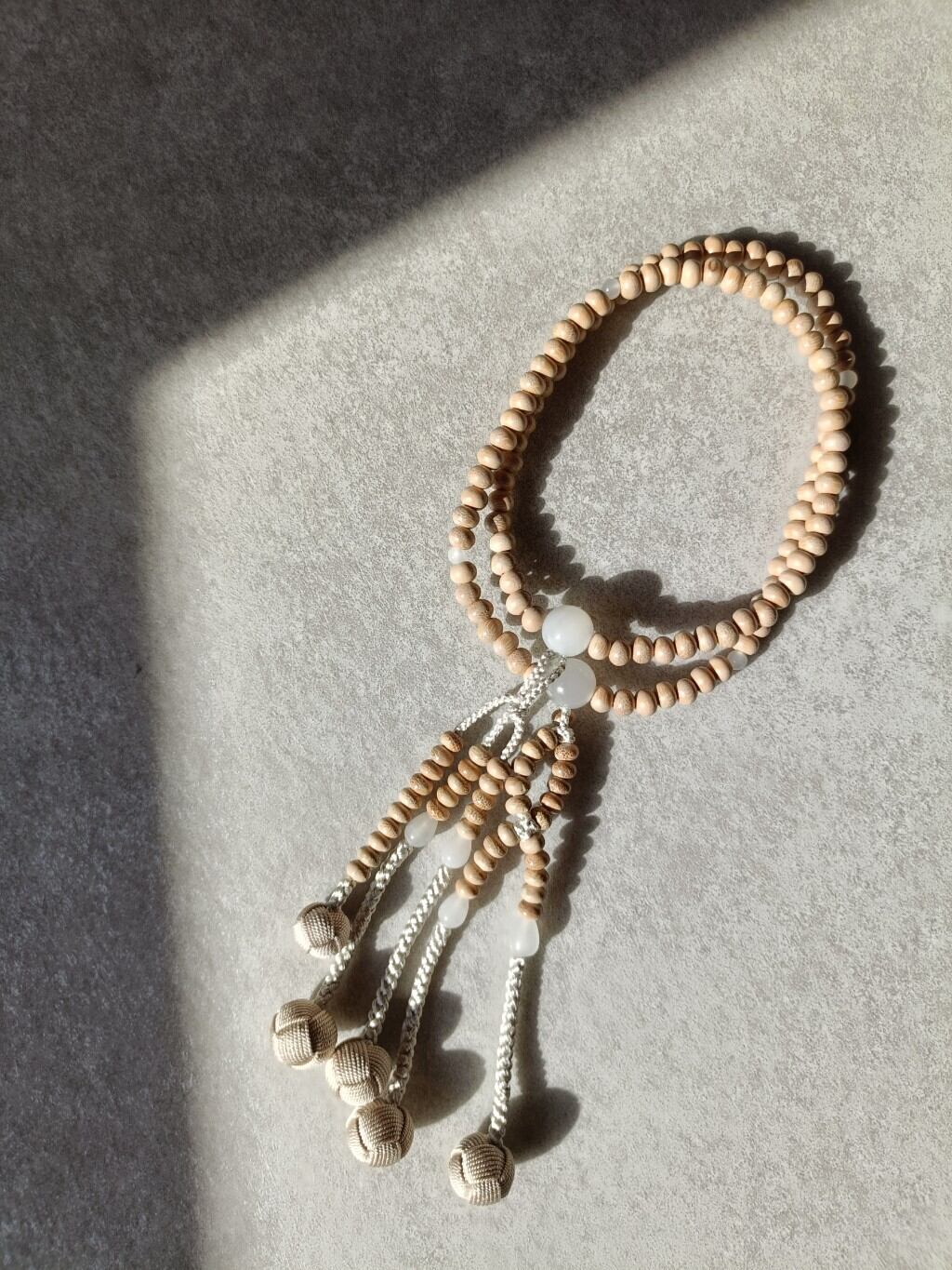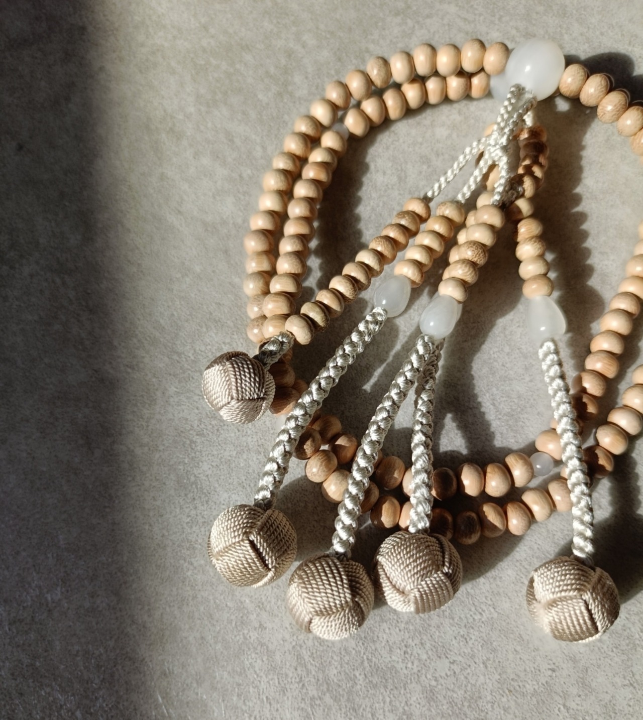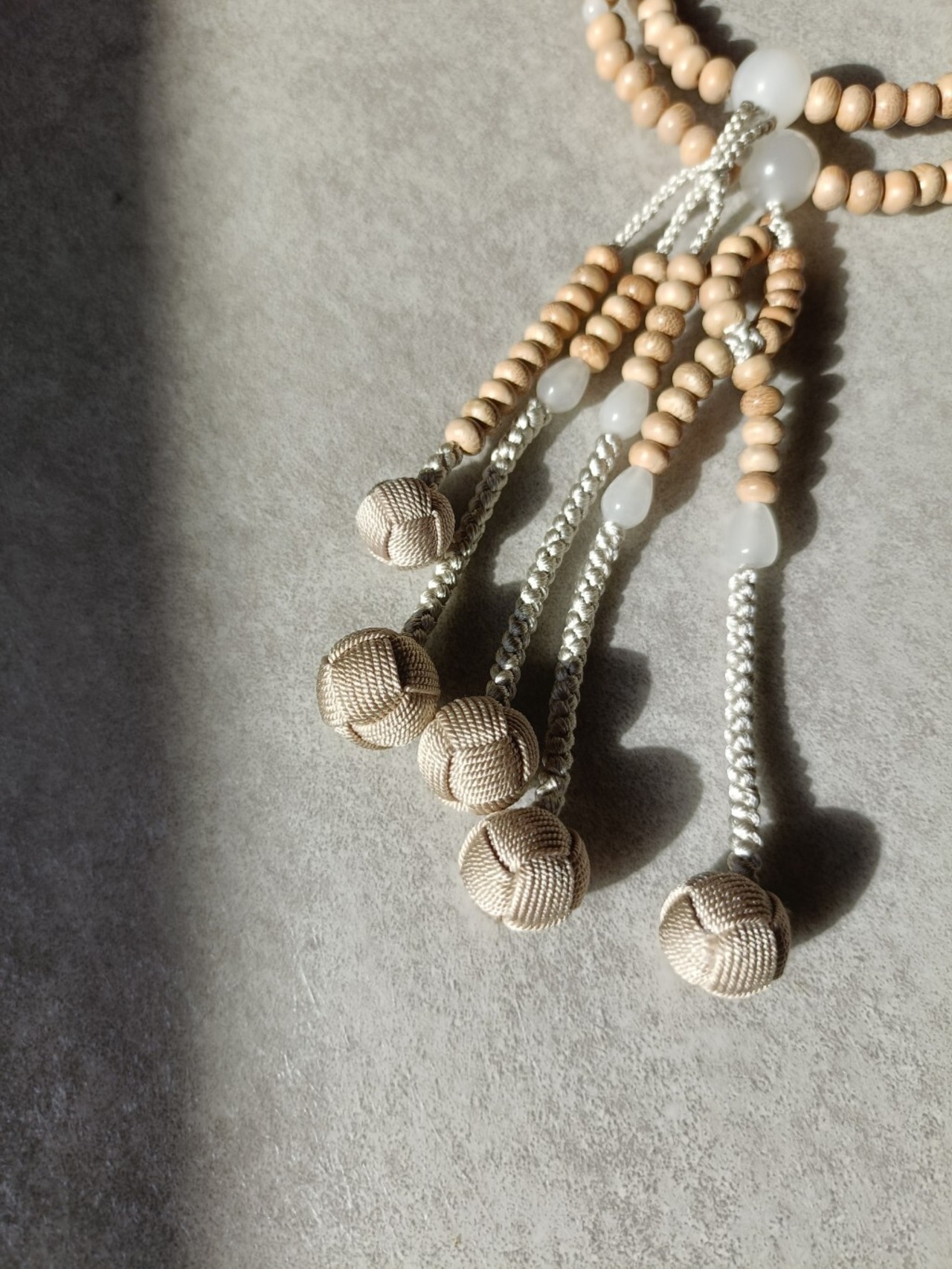 房の色は、数珠の印象の通り優しい風合いのベージュで、正絹の光沢がこの数珠の上品さをいっそう引き立てます。