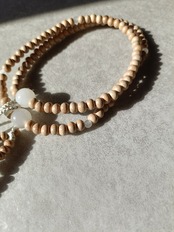 柊(ひいらぎ)は厄除けや守護の花言葉があり、古くから邪気を寄せ付けない縁起のいい植物として重宝されたきました。西洋では「家庭の幸せ」という花言葉でも親しまれています。明るい木調で使用するほど艶がでて手になじみます。乳白色の柔らかい印象が心を落ち着かせてくれる白瑪瑙を使用しました。