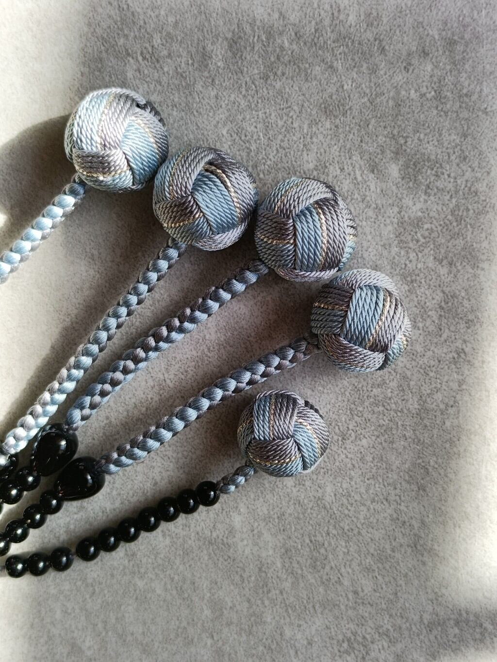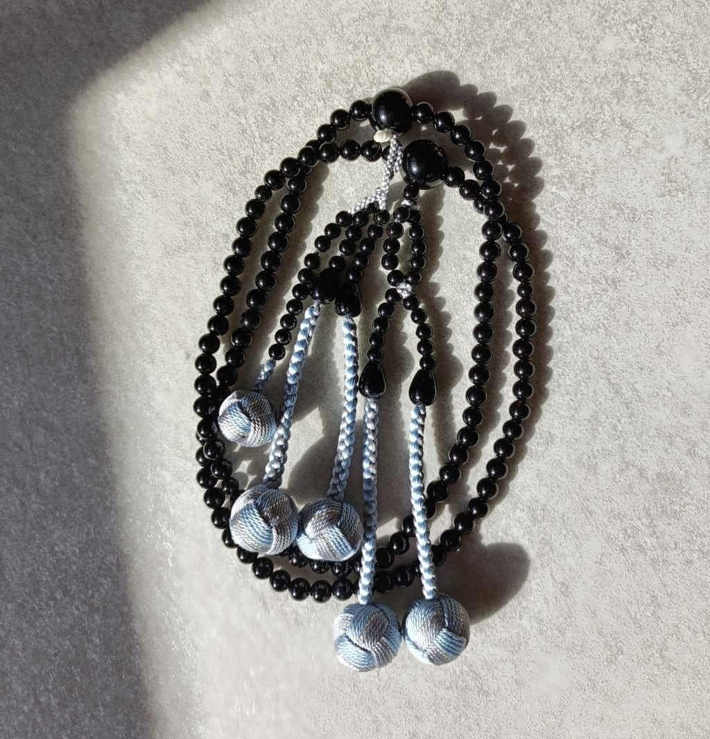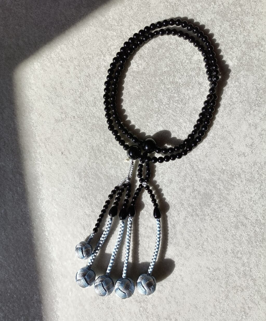 グレーにあさぎ、銀糸で誂えた正絹の房がオニキスの深い黒色を一層引き立てています。