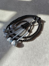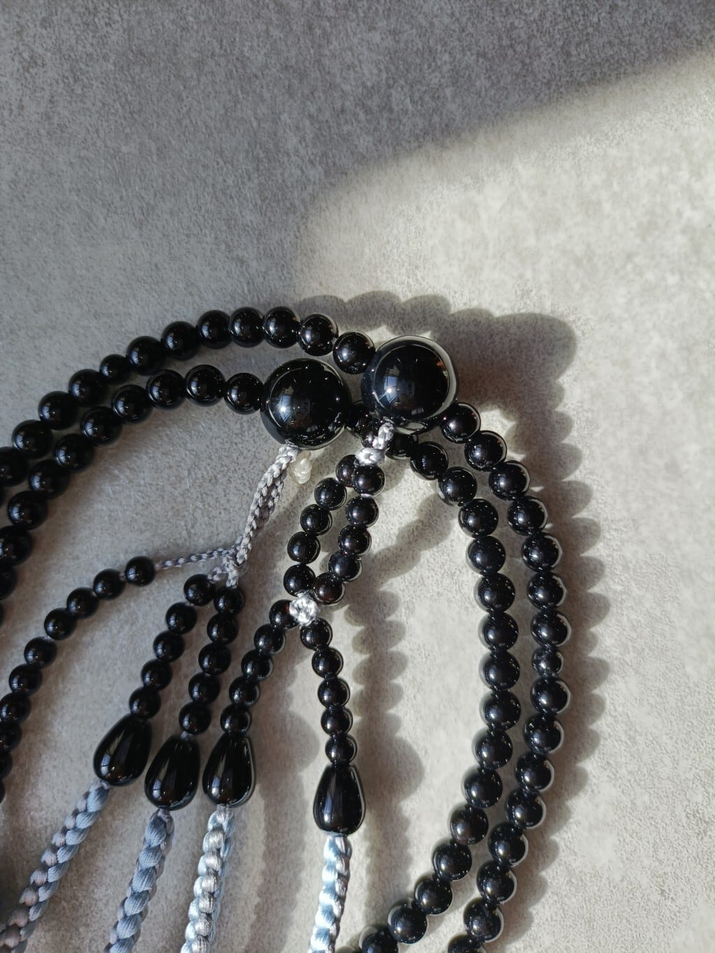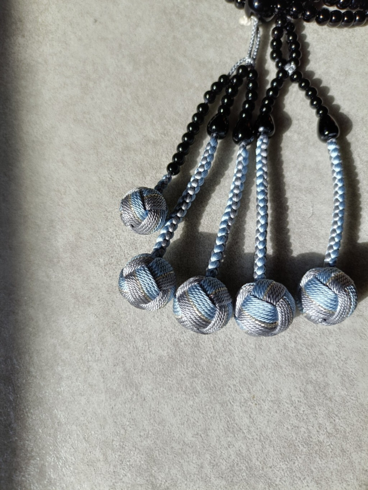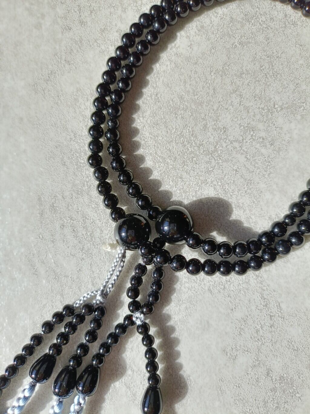 グレーにあさぎ、銀糸で誂えた正絹の房がオニキスの深い黒色を一層引き立てています。