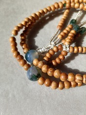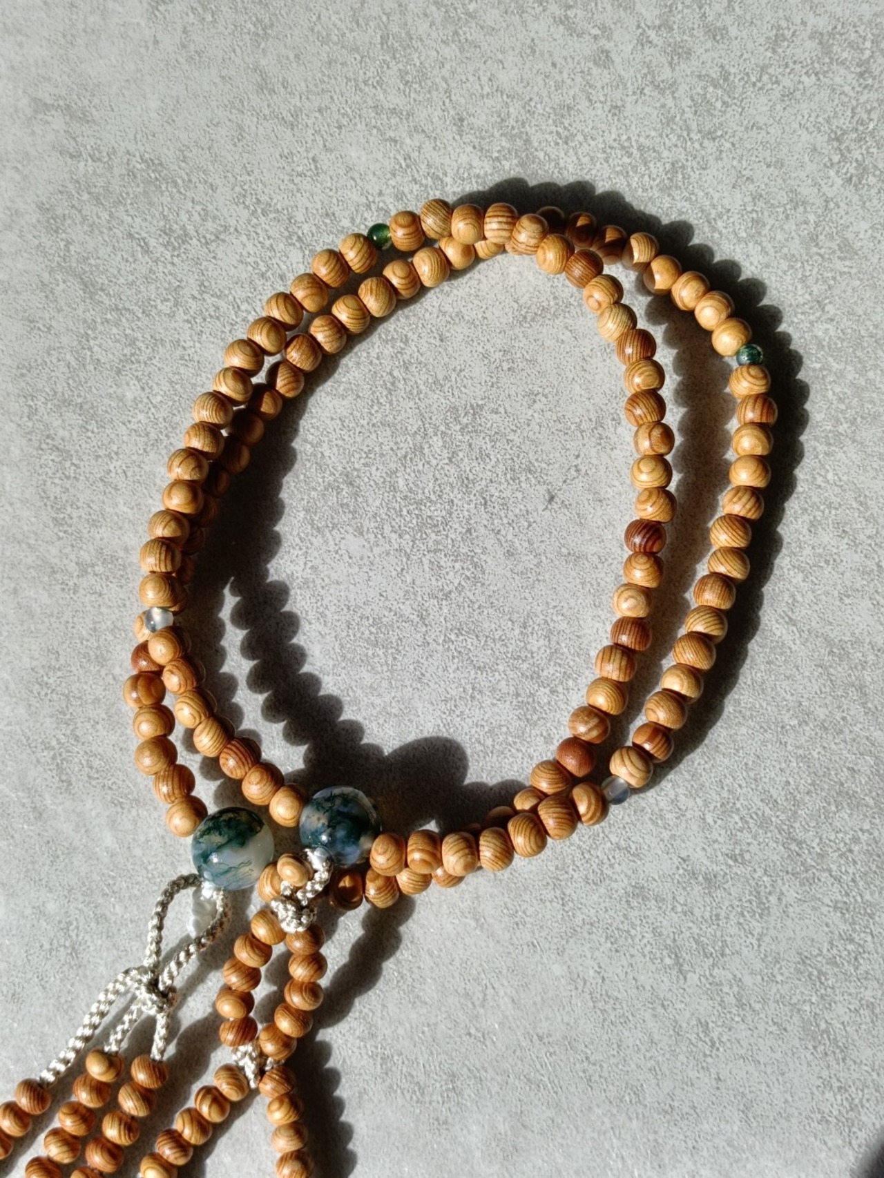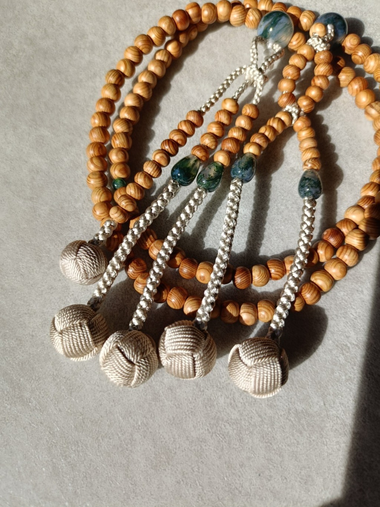 豊かな自然の息吹を感じる屋久杉を使用し、青苔瑪瑙で美しく仕立てた日蓮宗数珠です。屋久杉はその独特の木目と風合いにより、持つ人に温もりをもたらします。青苔瑪瑙は、深い緑色が印象的で、まるで大地が育んだ苔のような神秘的な魅力を持っています。