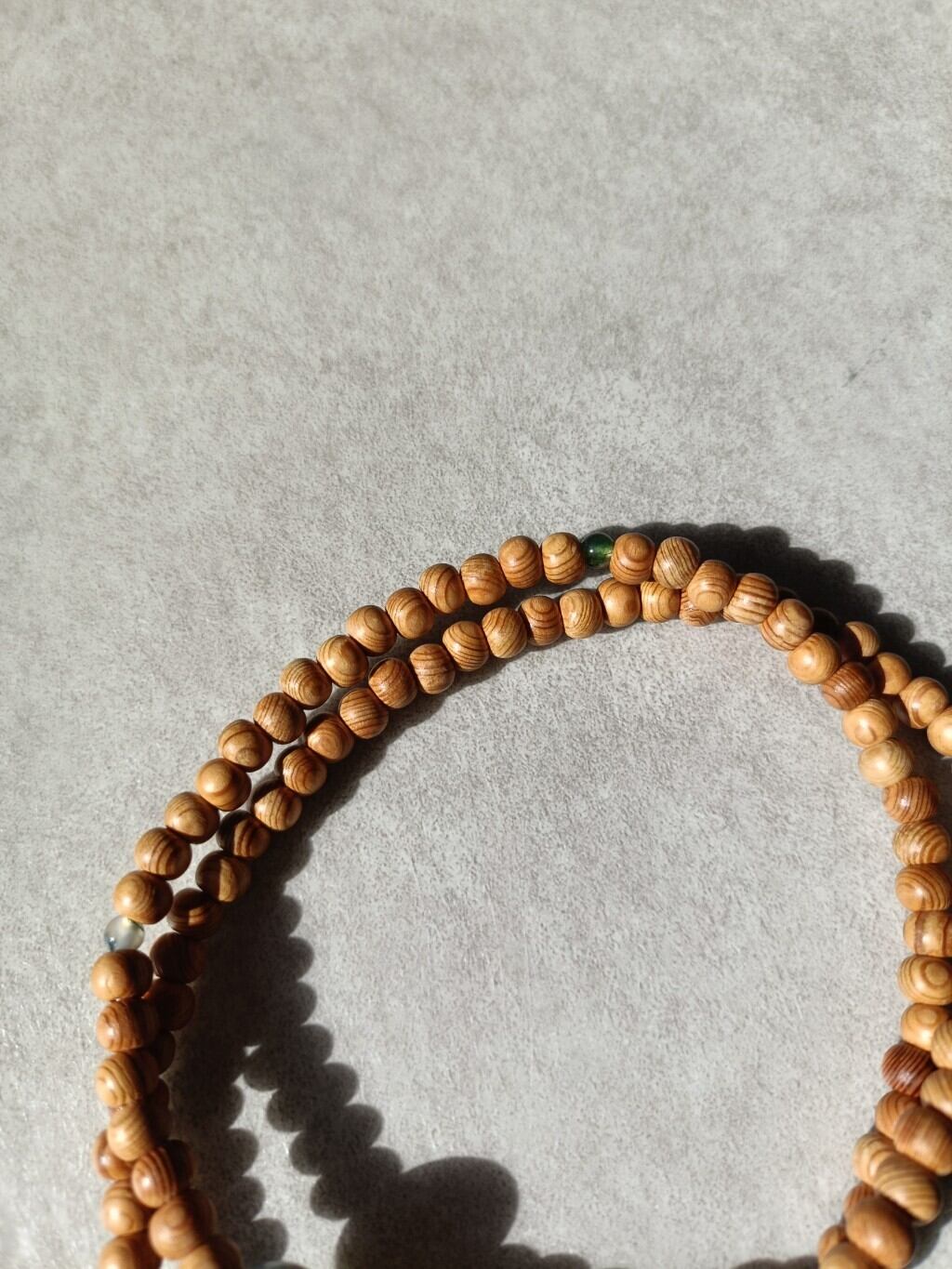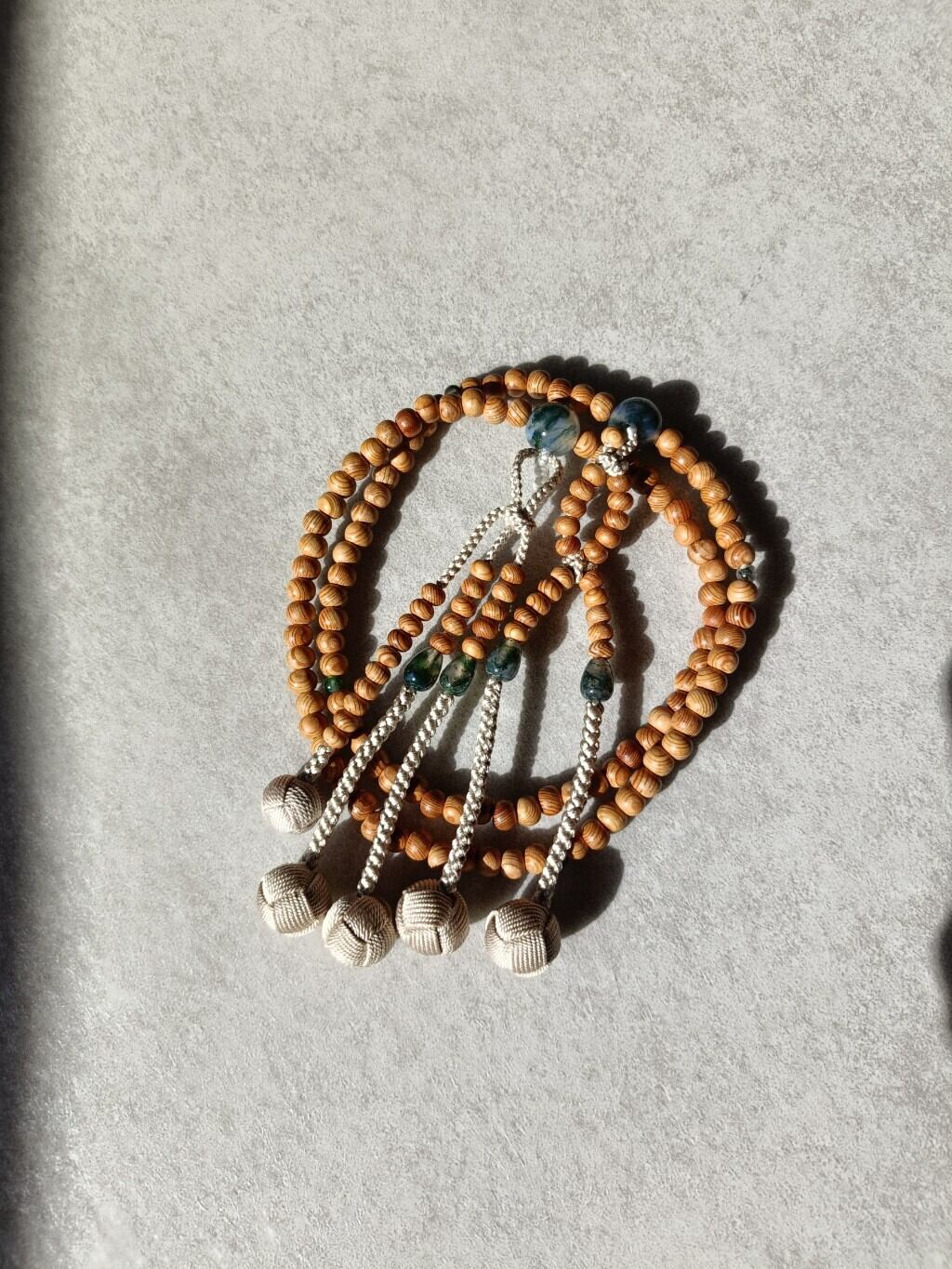 房の色は屋久杉の優しさを引き立てるベージュで、正絹の艶がこの数珠の柔らかい美しさをいっそう引き立てます。お勤めや心静かな時間を共に過ごすのにぴったりです。