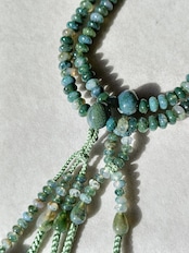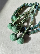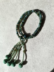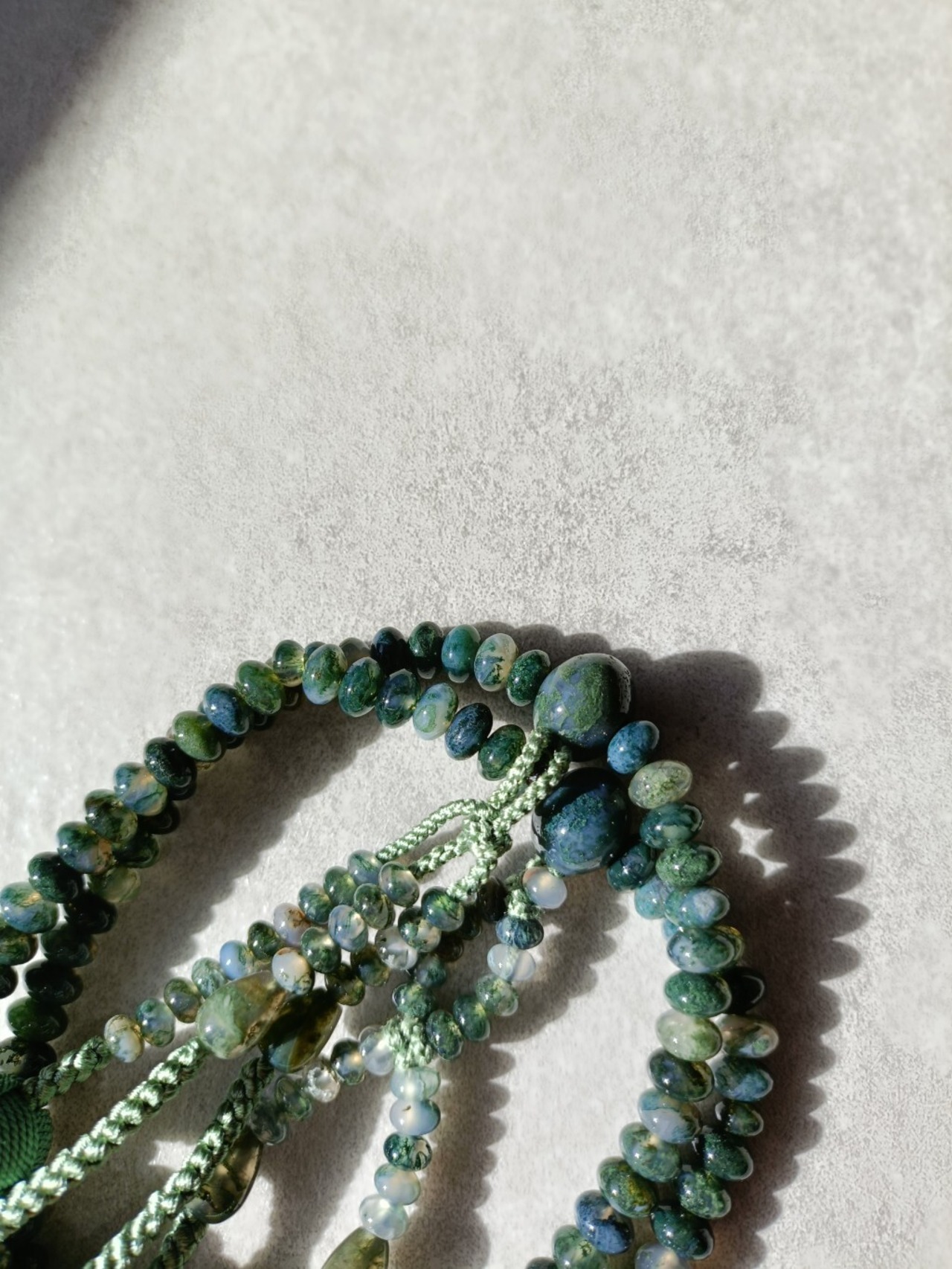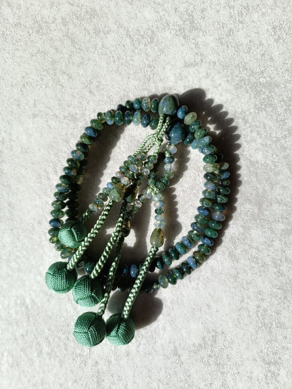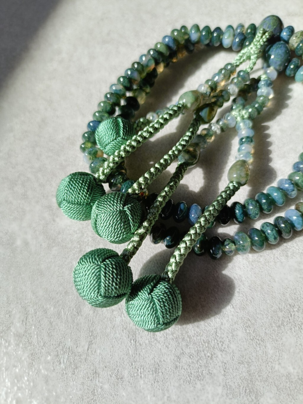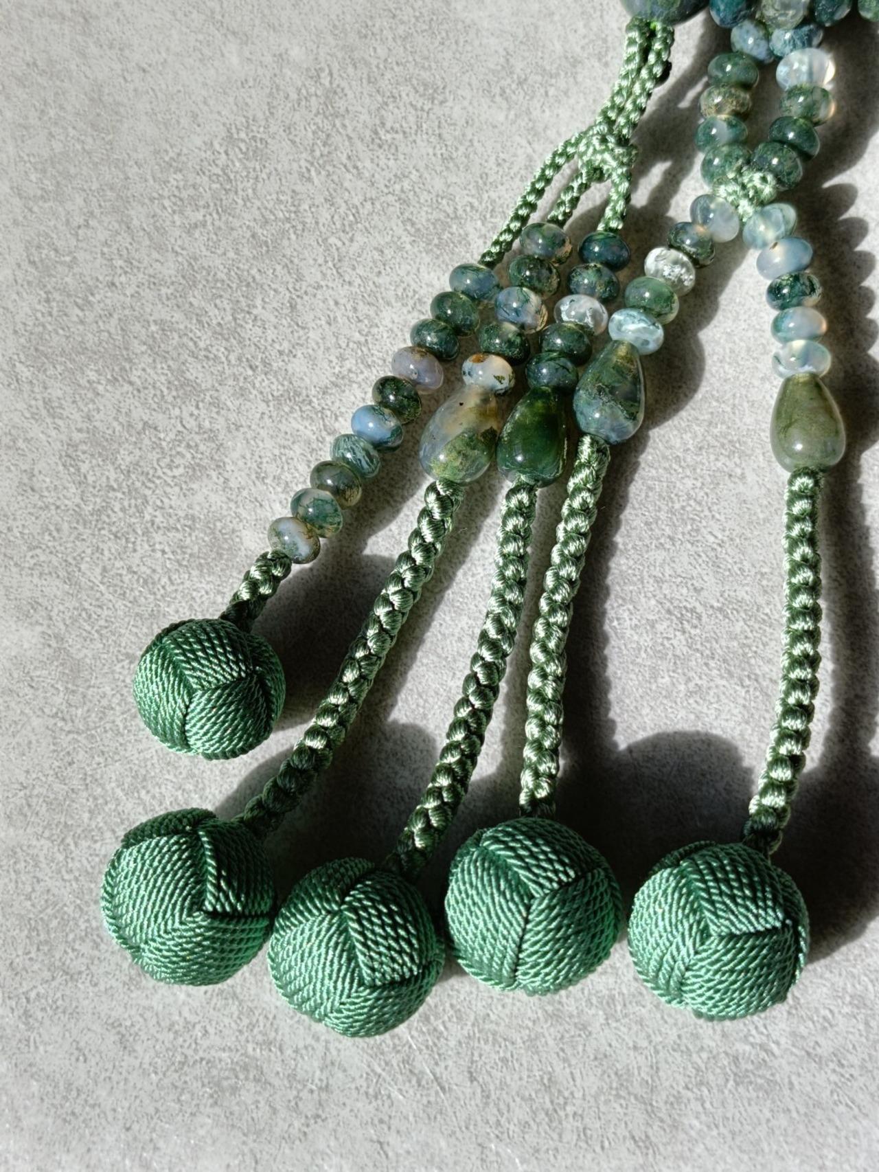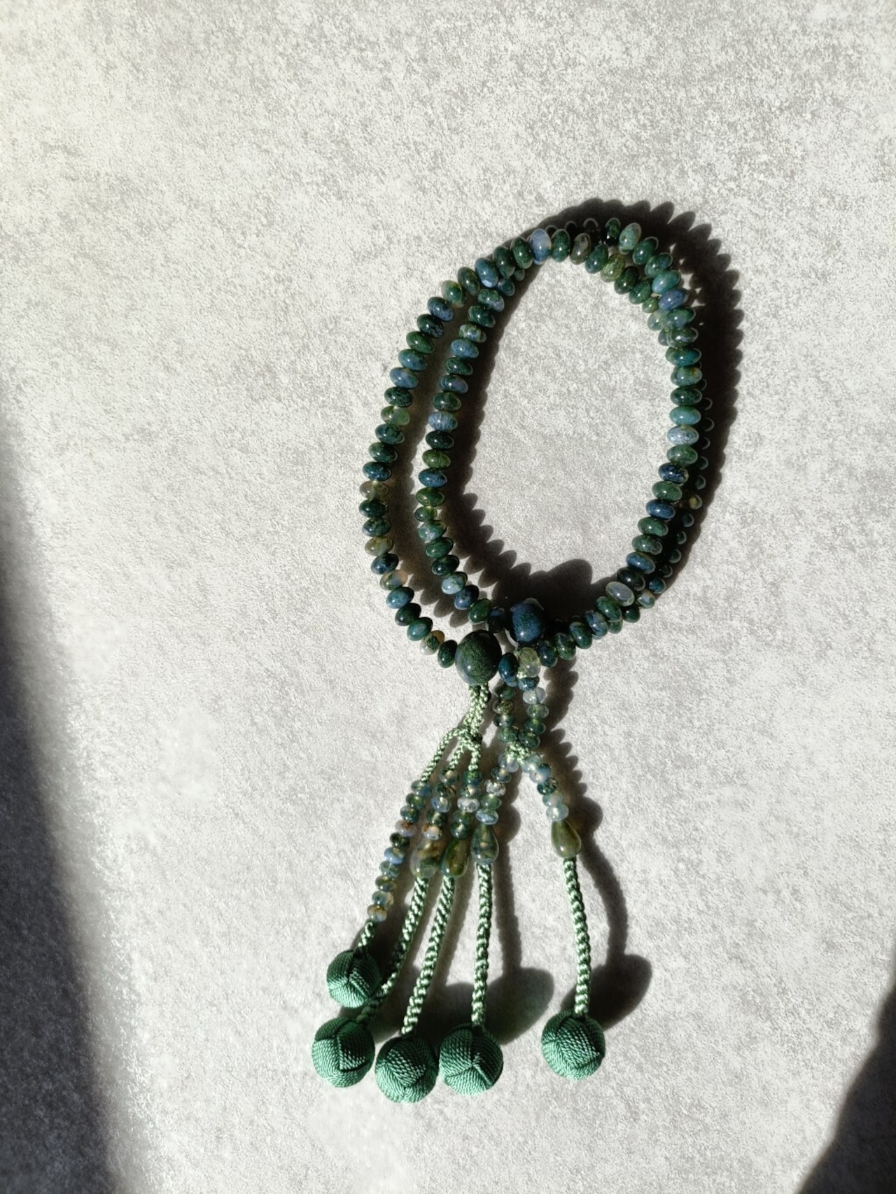 房の色は自然をイメージさせるトクサで、正絹の独特な艶が青苔瑪瑙を一層引き立てています。お勤めや大切にしたい時間に心を落ち着ける精神的な支えになることを願っています。