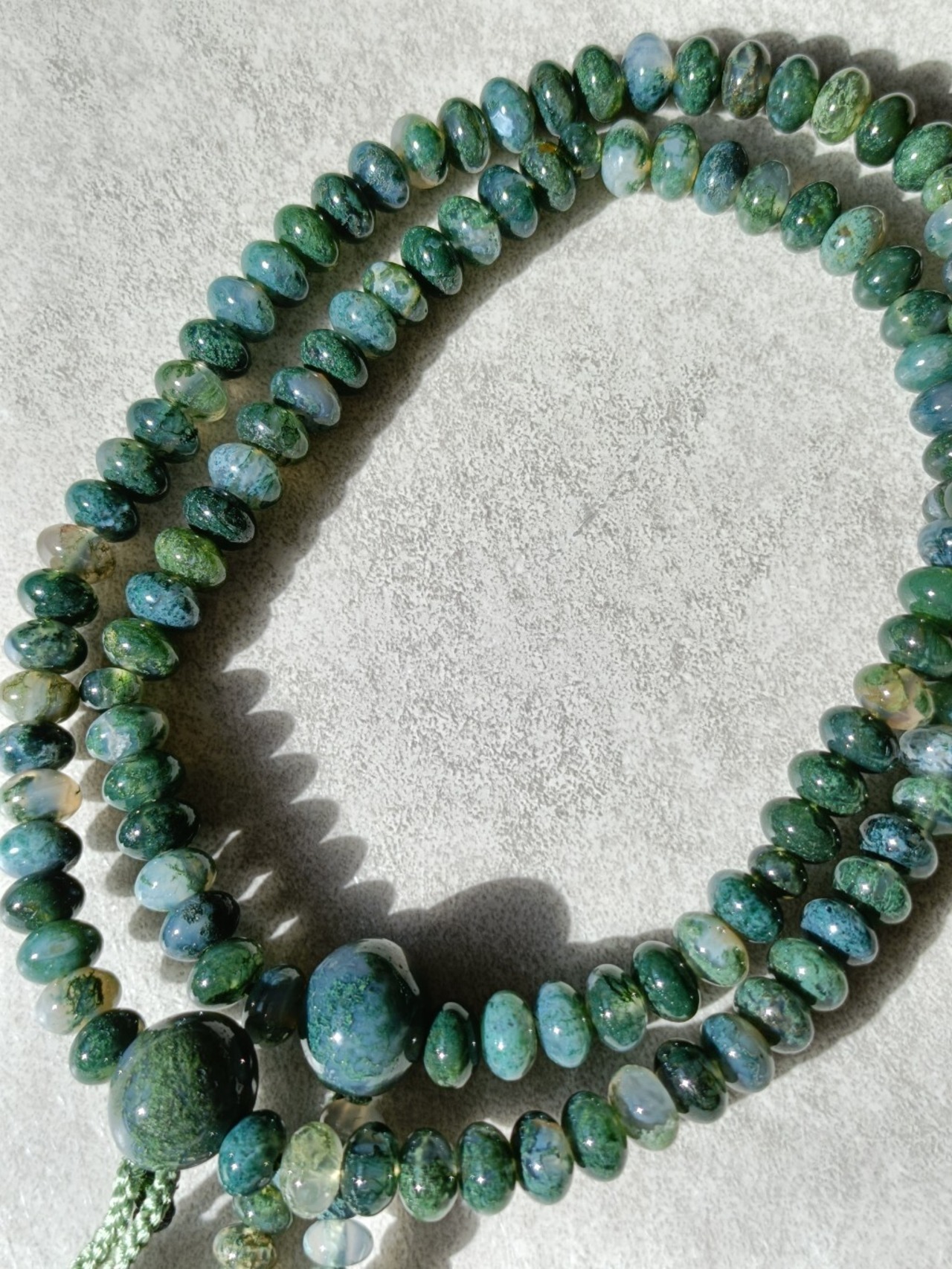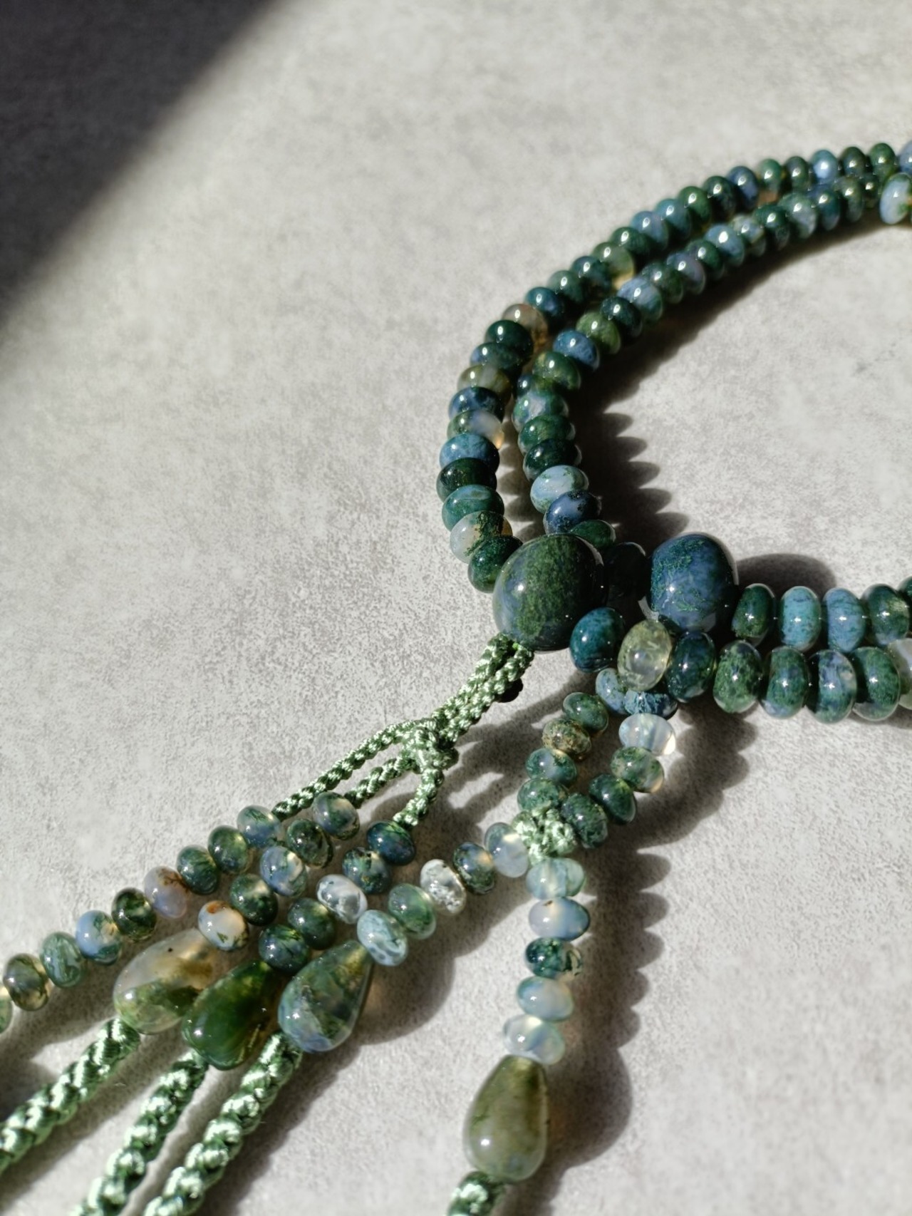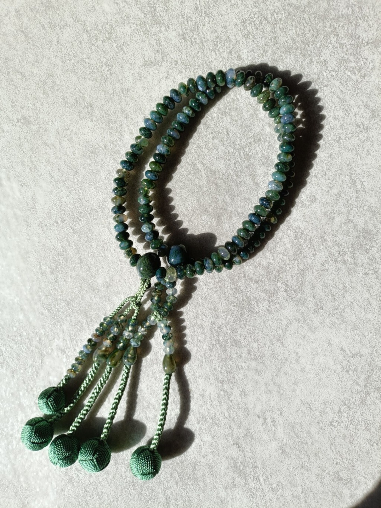 深みのある緑色が大自然の豊かな森に静かに息づく苔を思わせる青苔瑪瑙(あおこけめのう)を使用した日蓮宗数珠です。