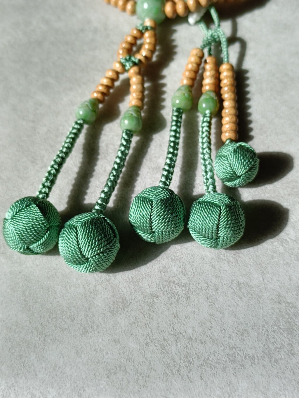 優しいグリーンの濃淡が天竺菩提樹の落ち着いたベージュ、正絹房のトクサ色と調和し温かみのある印象に仕上がりました。