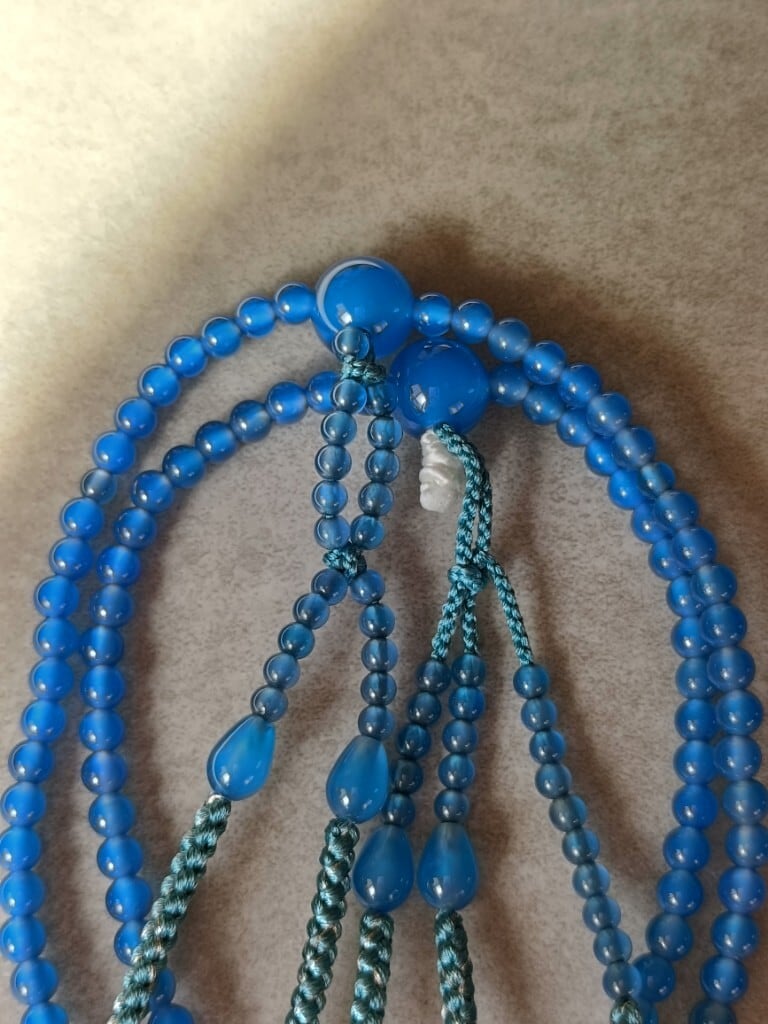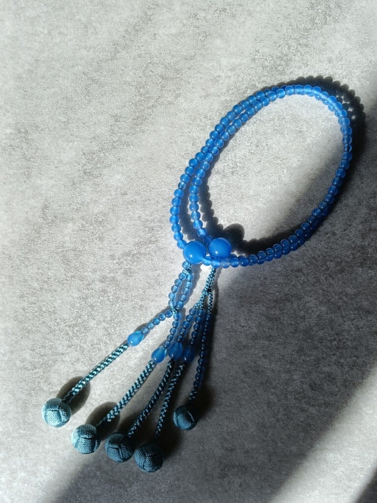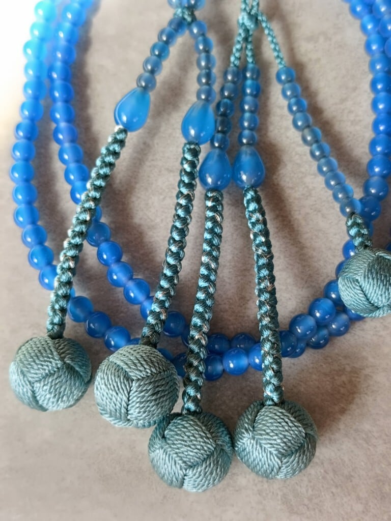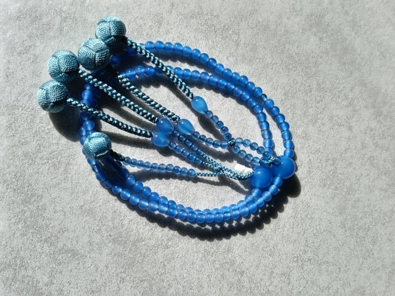 発色が美しい青瑪瑙(あおめのう)に相性の良いアサギ色の正絹房を合わせ軸には銀糸を散りばめ、透明感のある涼しげな落ち着きのあるお数珠に仕立てました。